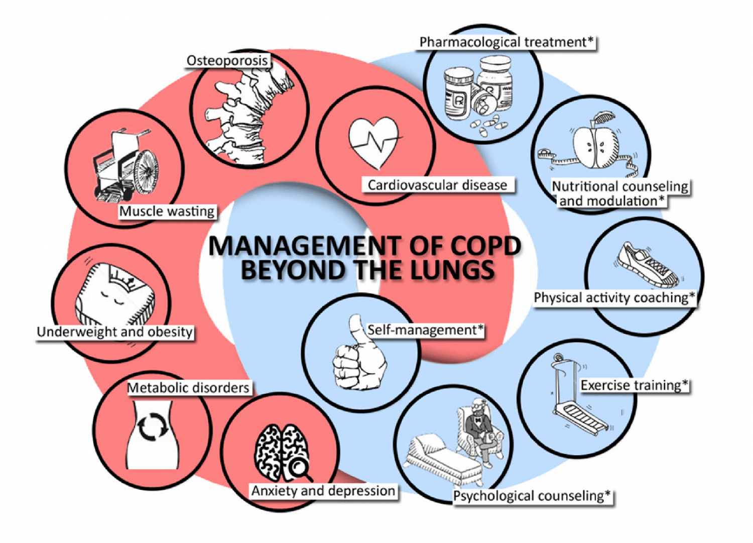 Gedurende de behandeling werkt een interdisciplinair team aan het verwezenlijken van de behandeldoelen. Het behandelprogramma is gebaseerd op een uitgebreid assessment waarbij op een gestructureerde wijze de complexiteit van de problematiek in kaart wordt gebracht. De behandeling richt zich daarbij op verschillende domeinen van de integrale gezondheidstoestand (Figuur 1). De behandeling wordt gevolgd door een resultatenmeting (outcome).